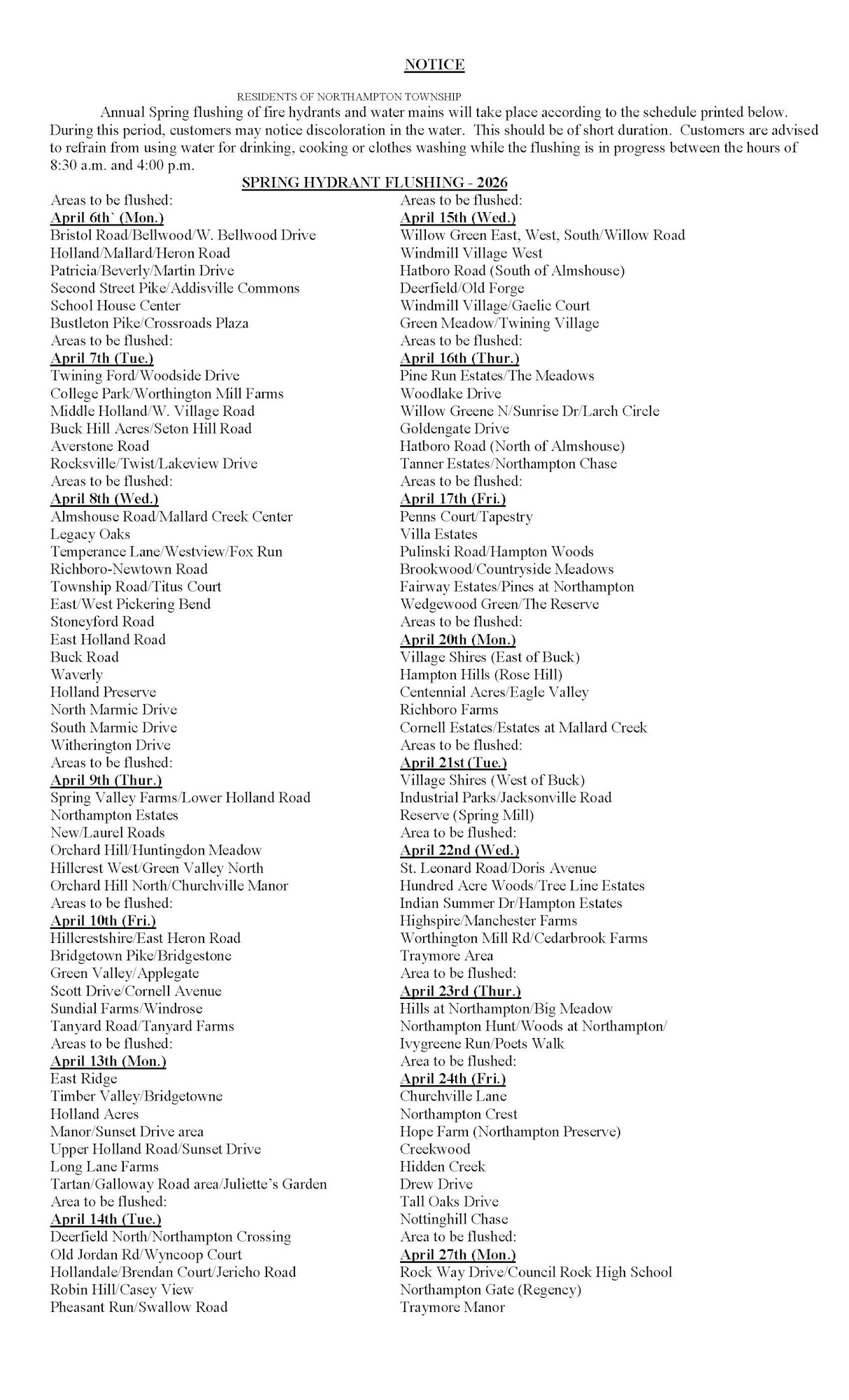 The Northampton, Bucks County Municipal Authority (NBCMA) has announced that its annual spring flushing of fire hydrants and water mains will run from Monday, April 6, 2026, through Monday, April 27, 2026.