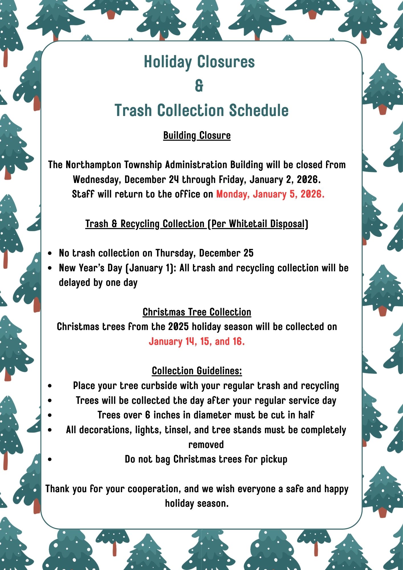 Home Resources News Holiday Closing and Trash Schedule Dec 19, 2025 General News General News Events Holidays Public Notice Trash & Recycling Information Special Event Videos All Articles Recent Articles Holiday Closing and Trash Schedule Bridge Repair to Close Route 232 (Second Street Pike) in Northampton Township PUBLIC NOTICE-Zoning Hearing Board-January 12, 2026 Resources Alerts Calendar Documents, Forms & Permits Feedback Maps News Site Map Northampton Township Administration Building 55 Township Road Richboro, PA 18954 Phone: (215) 357-6800 Fax: (215) 357-1251 info@nhtwp.org Hours Mon-Fri: 8:30 am - 4:30 pm View Contacts & Directory