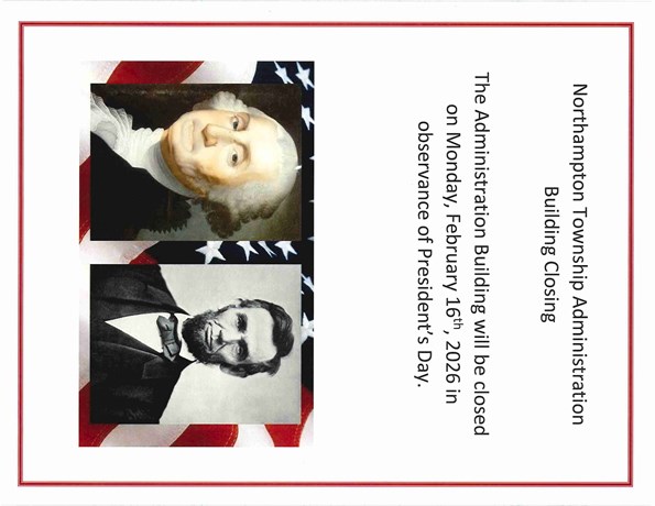 Home Resources News Administration Building Closed – Presidents Day Feb 10, 2026 Holidays General News Events Holidays Public Notice Trash & Recycling Information Special Event Videos All Articles Recent Articles NOTICE REGARDING RECENT CASELLA (WHITETAIL DISPOSAL) AUTOMATED MESSAGE Administration Building Closed – Presidents Day Traffic Advisory: PennDOT Pothole Repairs Scheduled Next Week Resources Alerts Calendar Documents, Forms & Permits Feedback Maps News Site Map Northampton Township Administration Building 55 Township Road Richboro, PA 18954 Phone: (215) 357-6800 Fax: (215) 357-1251 info@nhtwp.org Hours Mon-Fri: 8:30 am - 4:30 pm View Contacts & Directory